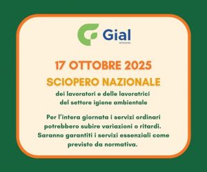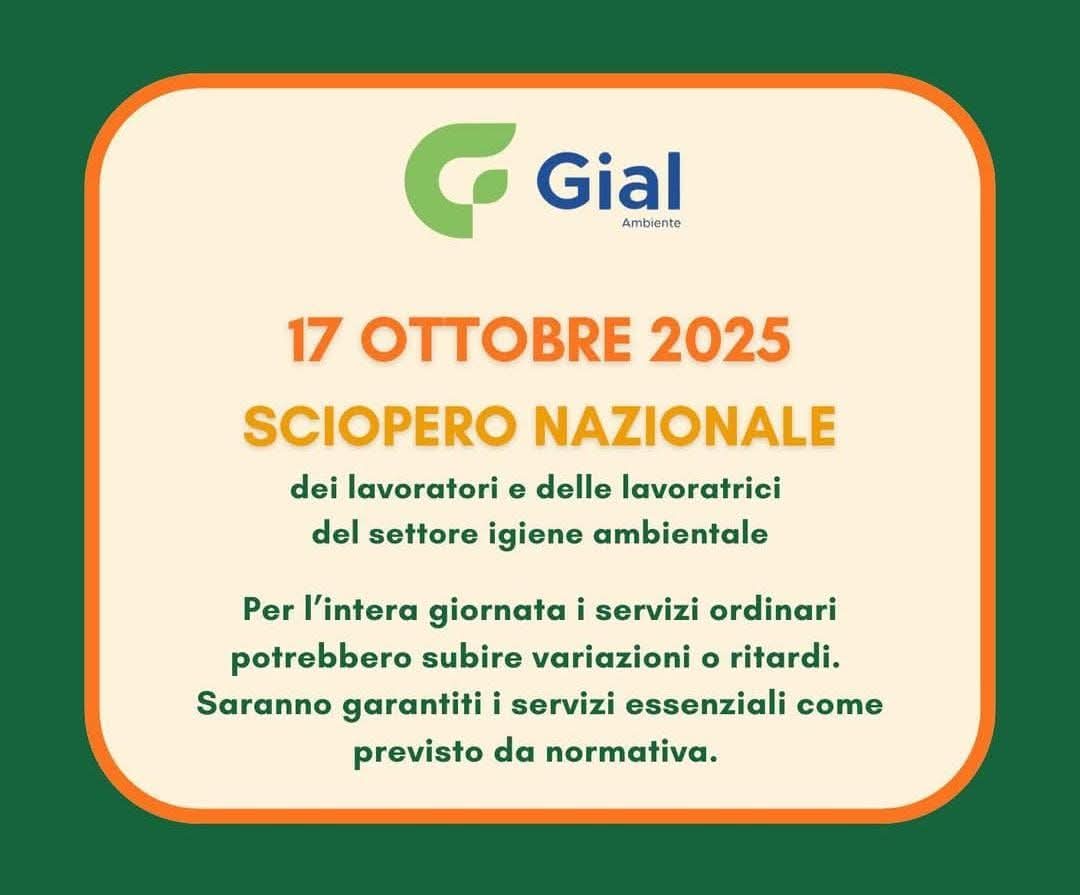 Sciopero Nazionale nel comparto Igiene Ambientale previsto per l'intera giornata di venerdì 17 ottobre 2025: il servizio di raccolta dei rifiuti non sarà garantito.