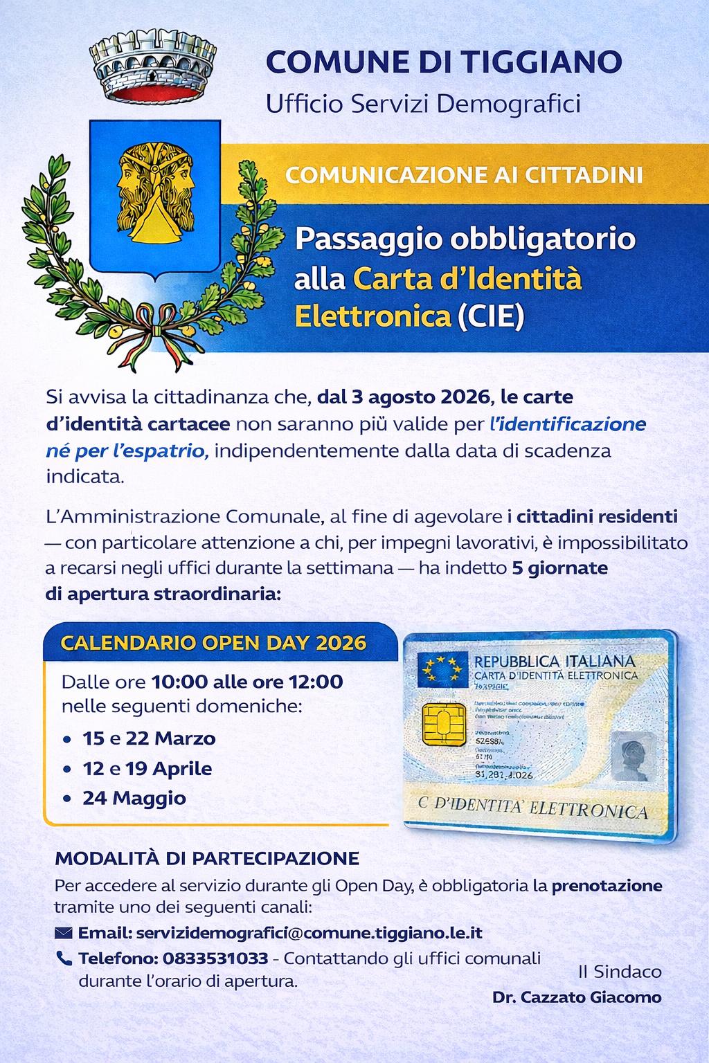 Per facilitare il passaggio al nuovo documento elettronico e venire incontro alle esigenze di chi è impossibilitato a recarsi presso gli uffici comunali durante i giorni feriali, l’Amministrazione Comunale ha predisposto 5 giornate di apertura straordinaria riservata ai cittadini residenti.