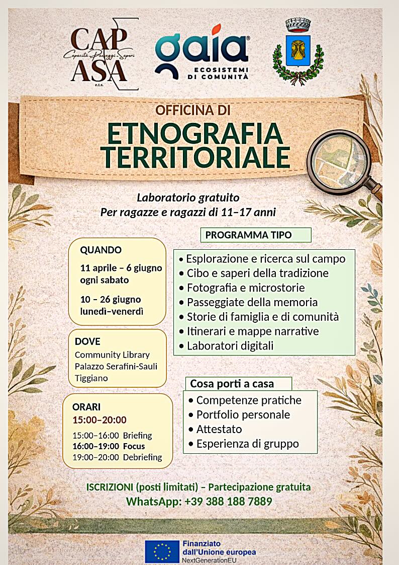 Sei un ragazzo o una ragazza tra gli 11 e i 17 anni? Vuoi imparare a raccontare il tuo territorio attraverso la fotografia, il video e la ricerca sul campo? Partecipa all'Officina di Etnografia Territoriale, un percorso formativo gratuito nel cuore di Tiggiano.